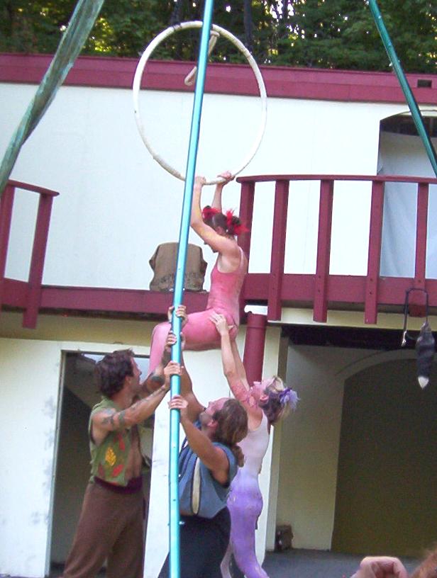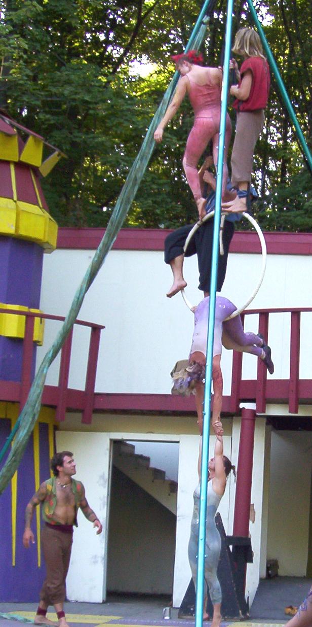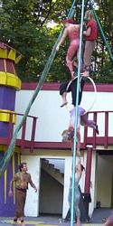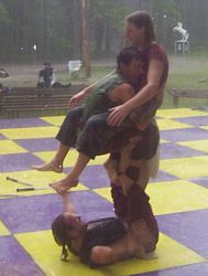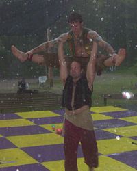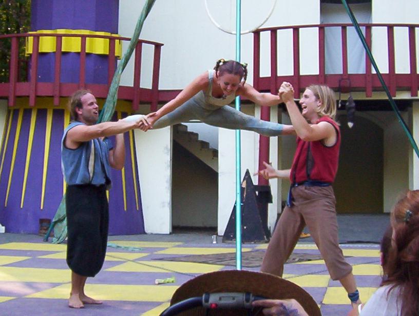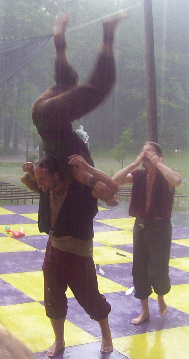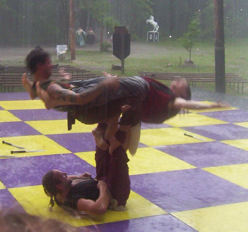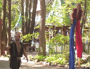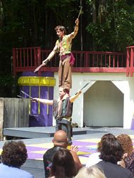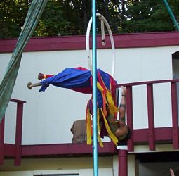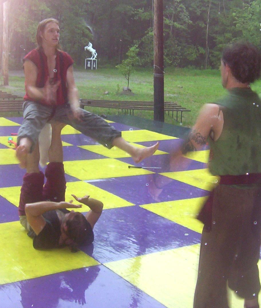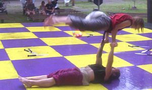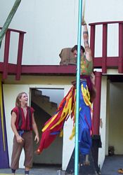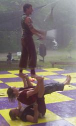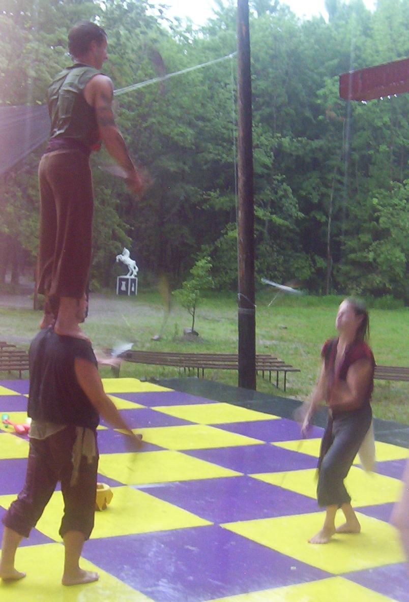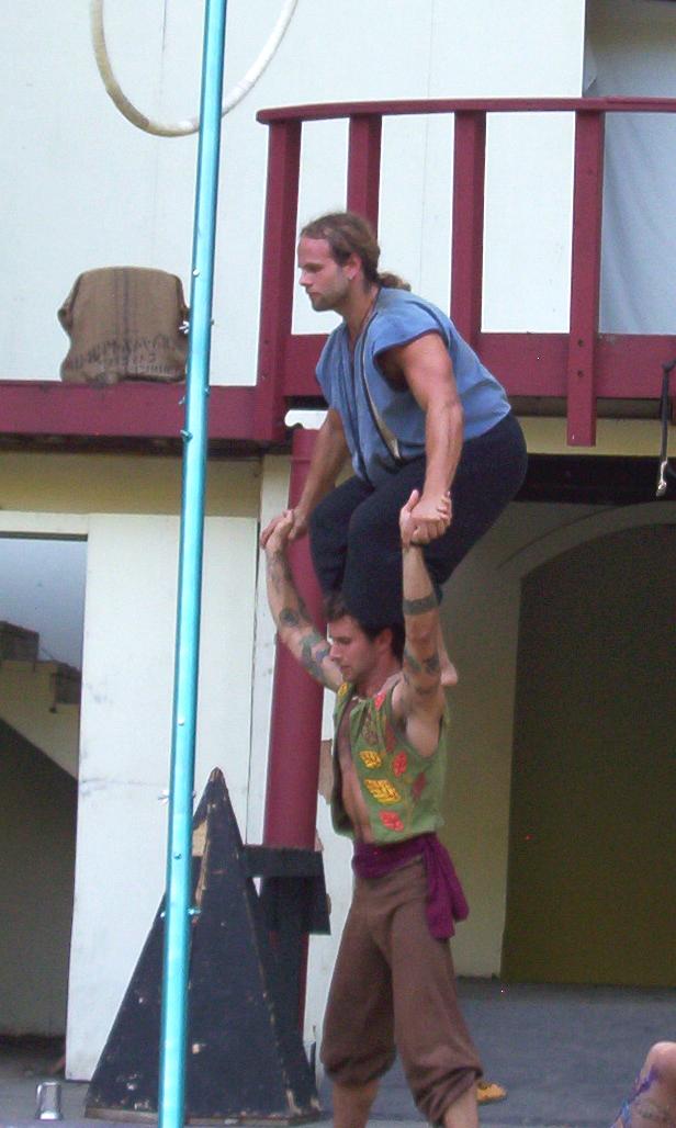 Cameron doing some ariel work with the stilts on.