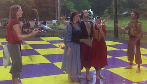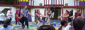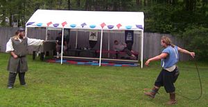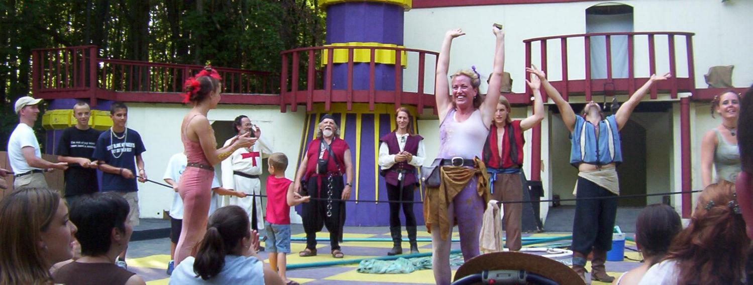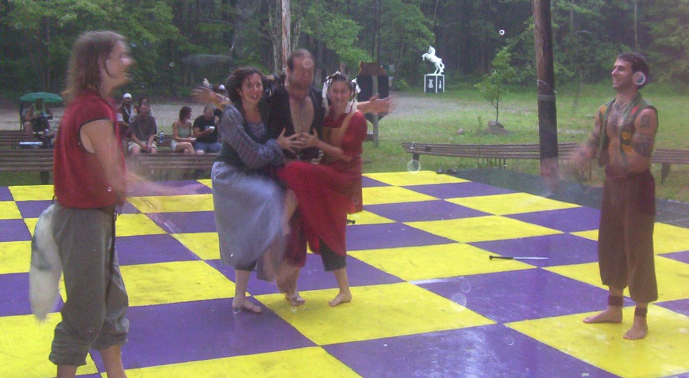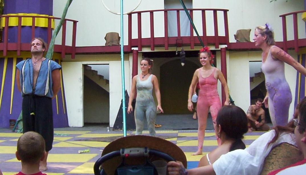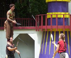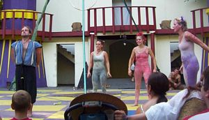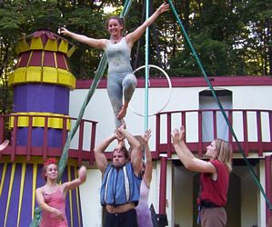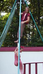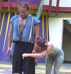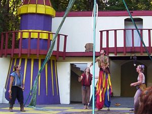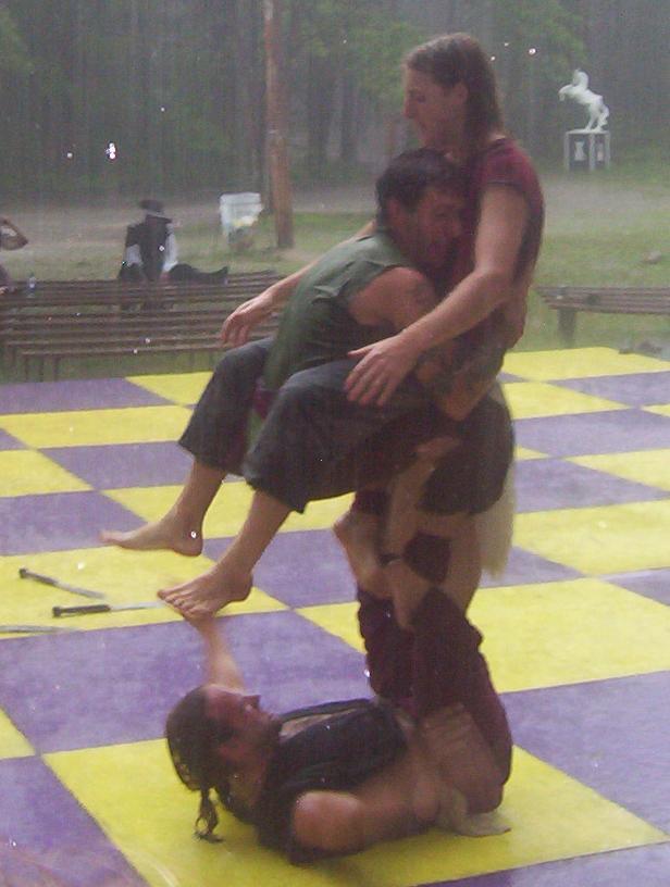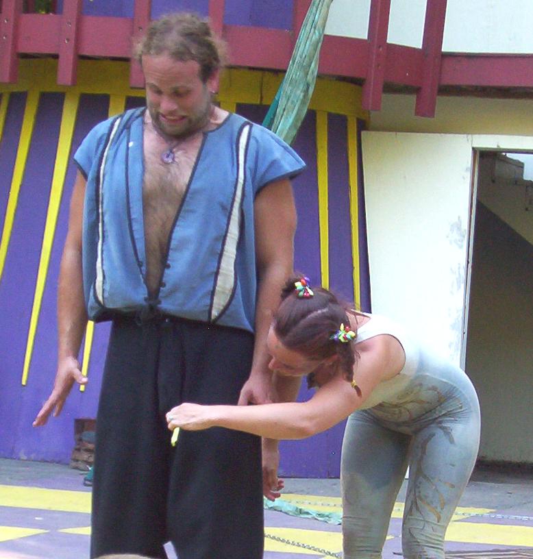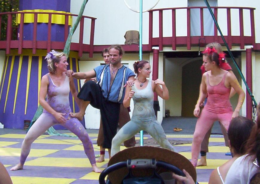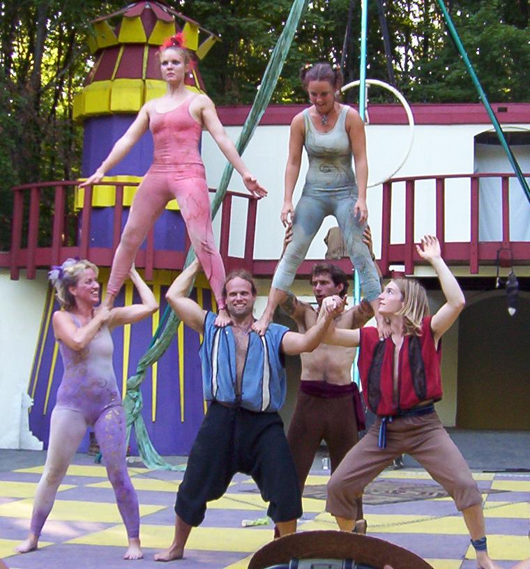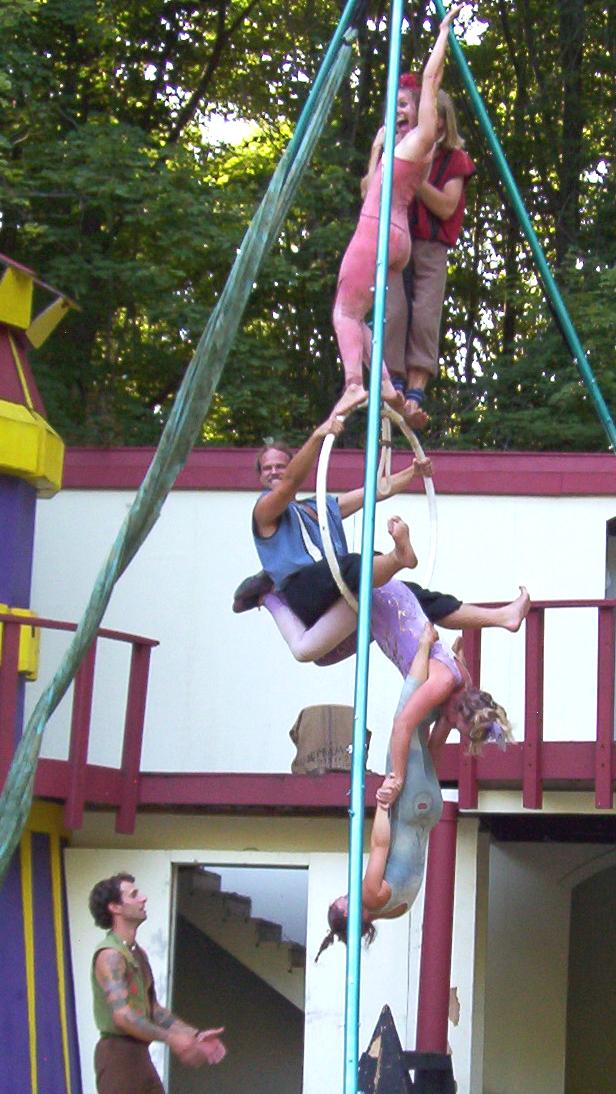 Cameron doing some ariel work with the stilts on.