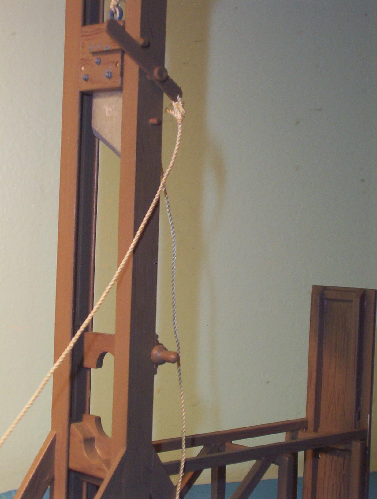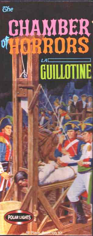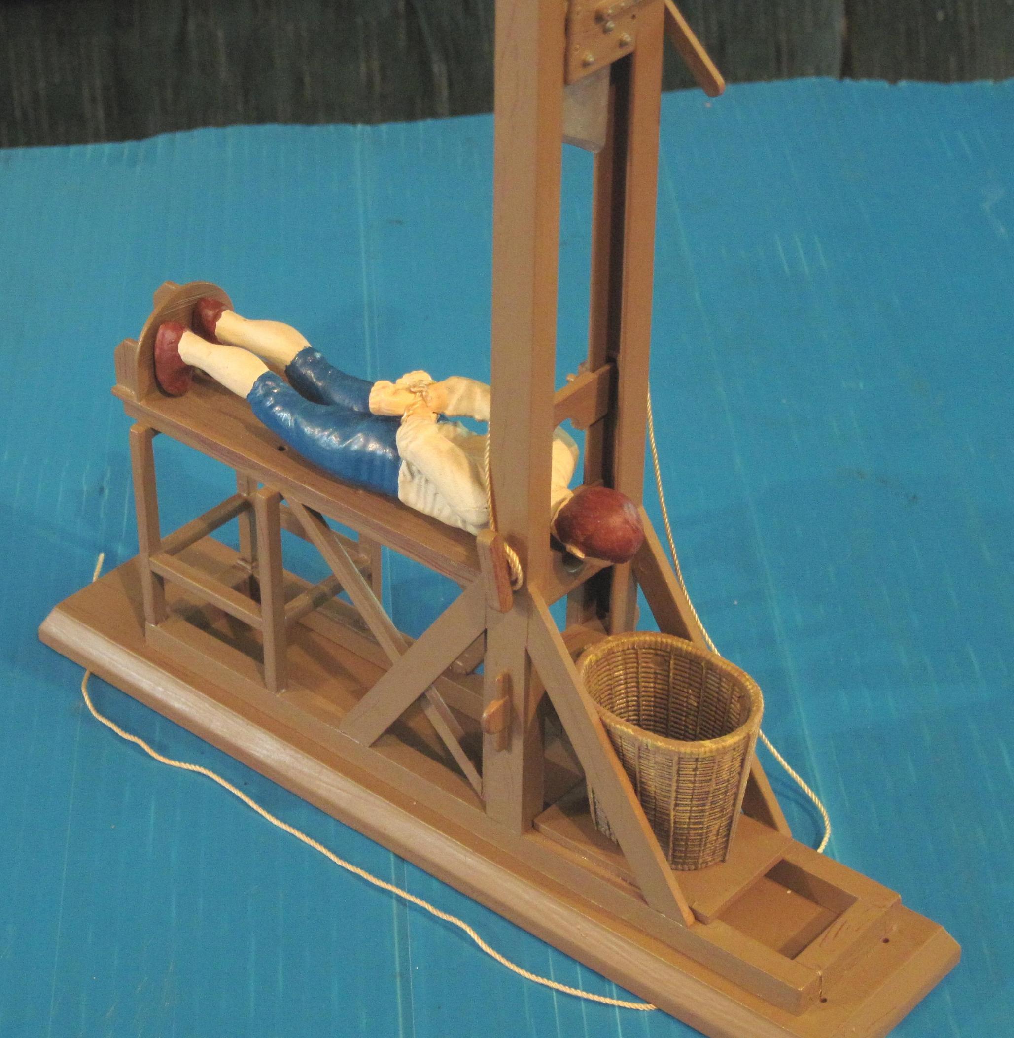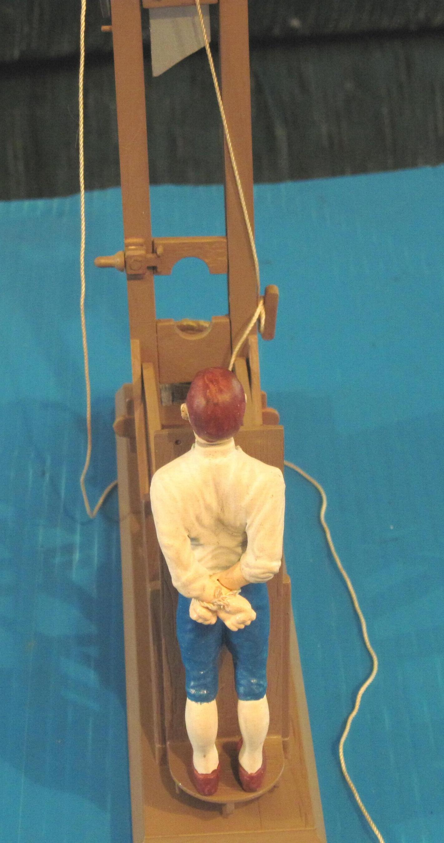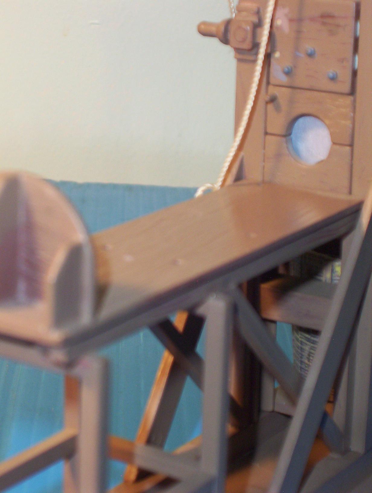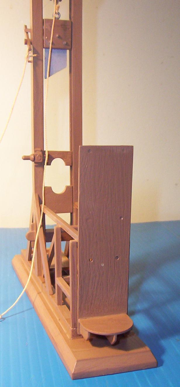 into the model, but found an easier way. First I base coat with a brown primer. Then I spray with a lighter shade of brown. While the paint is still wet, I drag a ratty toothbrush through the paint, in the direction of the woodgrain. After it dries and cures I wash with a dark brown. By draggin the brush through the wet paint, it exposes some of the darker base coat. Also get the bonus effect of a wood texture in the paint, with grooves and such. Make sure the paint has cured before washing. I gave mine at least a week. If you don't wait until the paint is fully cured, you run the risk of removing the paint with the thinner in the "wash". For easier painting, I am painting sub assemblies and larger parts (such as the base and side pieces)first, then assembling after. It makes adding the grain easier and more realistic but will make the final assembly more difficult. I will have to scrape the paint off anywhere that needs glued. I do have the victim assembled and primered.I haven't decided how I want to paint him yet. That will probably be the last thing I do on this model.I will post more as I get farther into this model A couple of building tips. Add some weight to the blade. There is a little hole in the top of the blade assembly just for this purpose. I think it is easier to just add the weight when I built it. Also, I would not recomend painting the rollers for the blade assy. It would cause too much resistance and you want the blade to be able to slide smoothly up and especially down. I did not glue the top brace in place on mine. It has a very snug fit that will hold it in place. That coupled with the string and weight of the blade hold it together just fine. The reason I did it like that is for future maintenance. If I ever need to work on the rollers or other parts, I can easily disassemble it. I just got around to snapping some pics of this model. I ended up not using a wash to highlight the woodgrain. It looks more natural without it. Still haven't finished the victim yet. The head is done. Shoes are almost done. Still working on the uniform. I figured I would at least put up a few shots of the G itself. Enjoy. I swear I will get the rest finished by the end of 2001 |