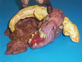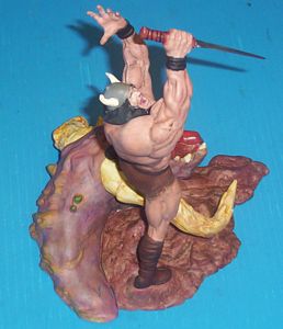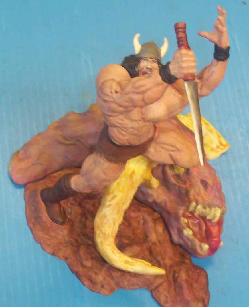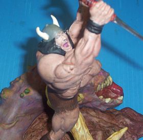 | Here it. Finally done! I started this kit in 2001 and finally finished it in time for Wonderfest 05. If you can't tell, this is a heavily customized version of the Toy Biz Thor kit. I made several modifications and turned it into Conan the Barbarian. For more about the modifications, you can check this page. To find out more about the building and painting of the base, check here. And to learn how I made the sword, that is on this page. On this, the main page, I am going to talk more about the painting and finishing touches. One of the things that