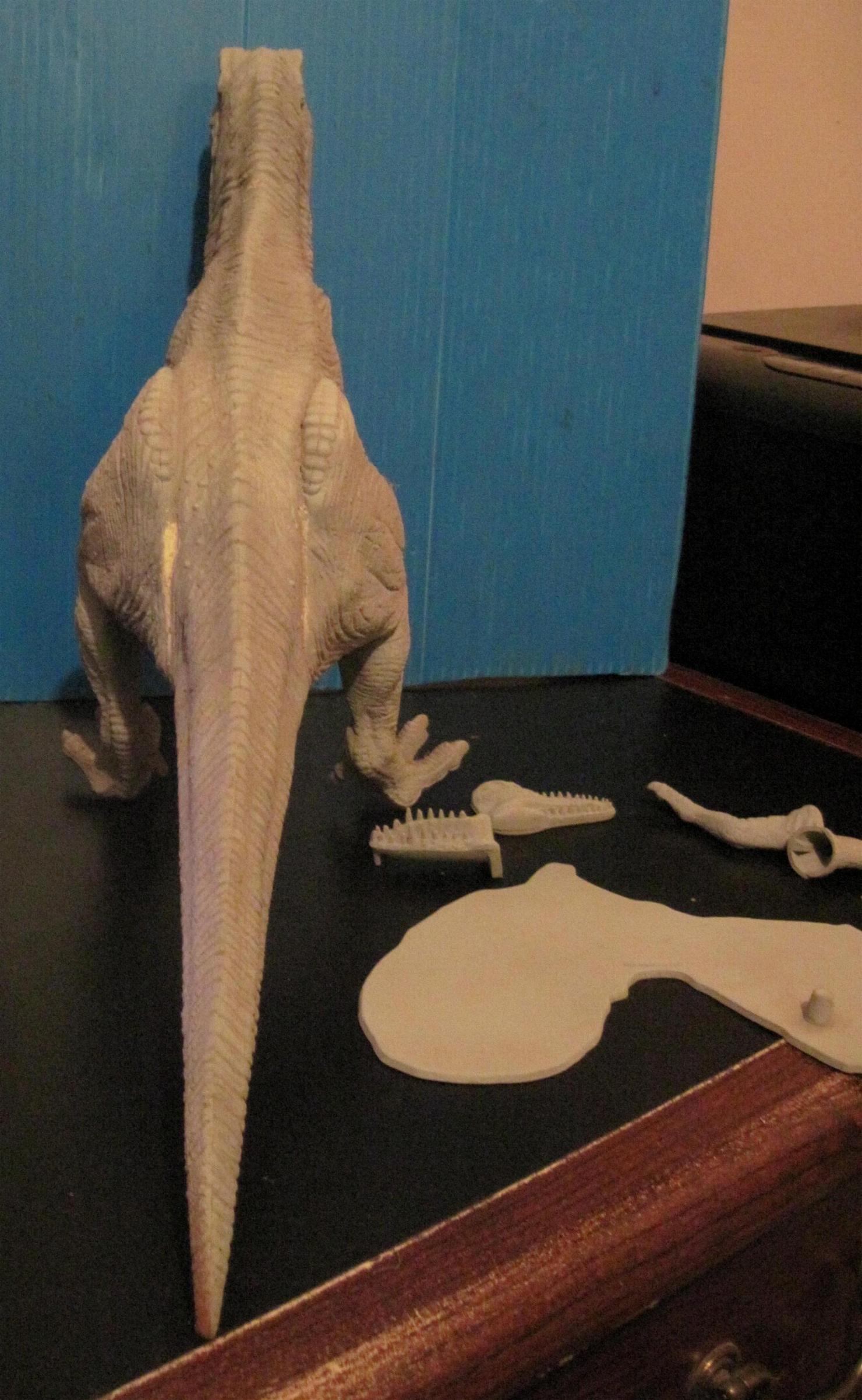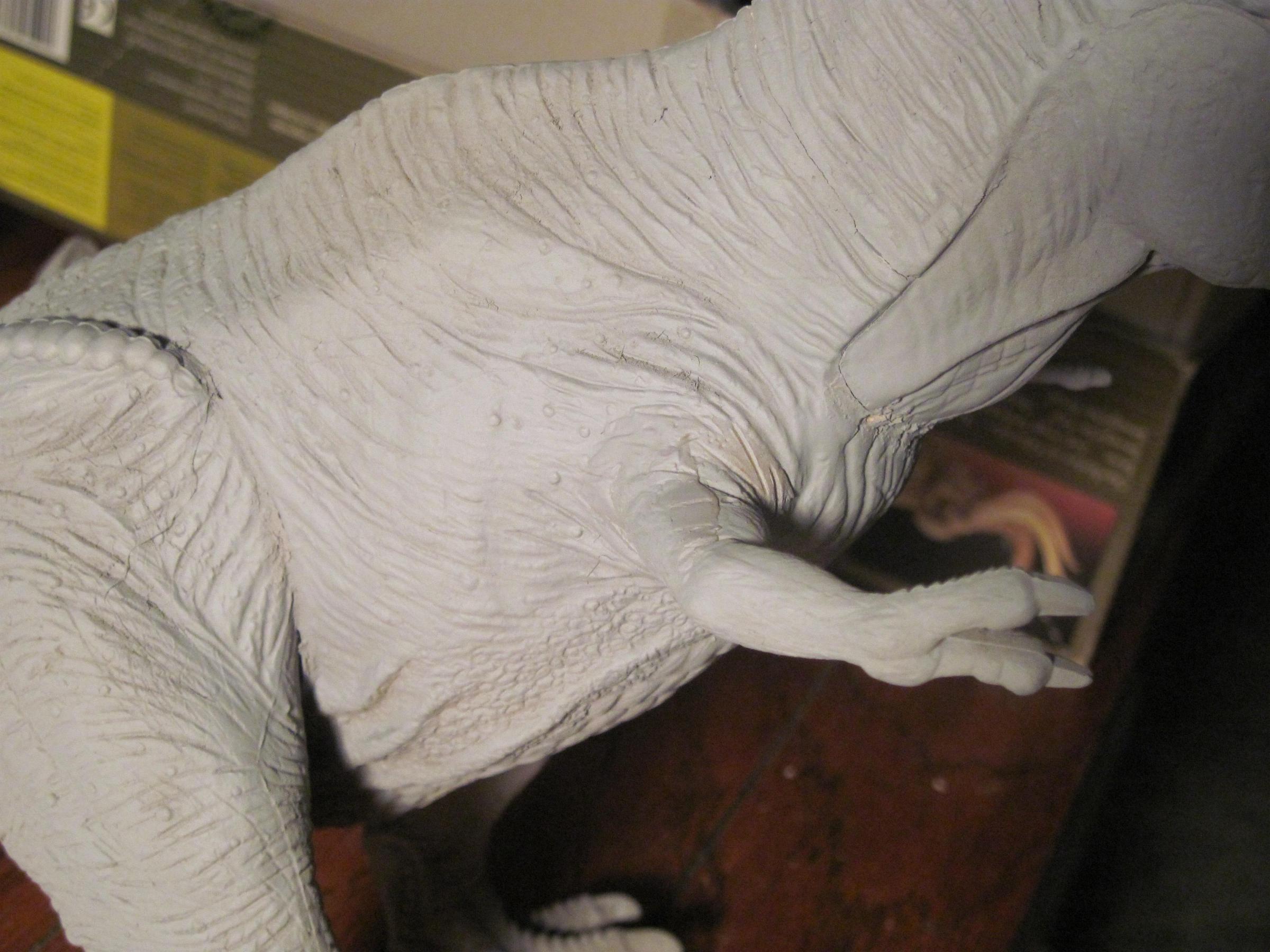 ![]() Well, I glued the arms on, and puttied things up. But after another coat of primer, I see lots of seem work that still needs done. ![]() Where the leg halves meet on the top of the legs, as well as where the legs join the body. The neck. ![]() Where the arm halves come together, and where the tail joins the body. ![]() Still, not too much work. Should go quick. |